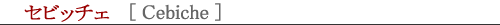 | 前菜として出てくるペルーの代表料理のひとつ。新鮮な魚介類(白身の魚やイカ,タコなど)を香辛料とたまねぎなどをレモン汁で合えたさっぱりとした料理のひとつ。ペルー風酢の物といった感じ。 |