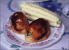 | ロコトという肉厚のピーマンの中にひき肉を詰めて調理したもの。付け合せのジャガイモも美味。中には猛烈に辛いピーマンがあるので要注意。 |